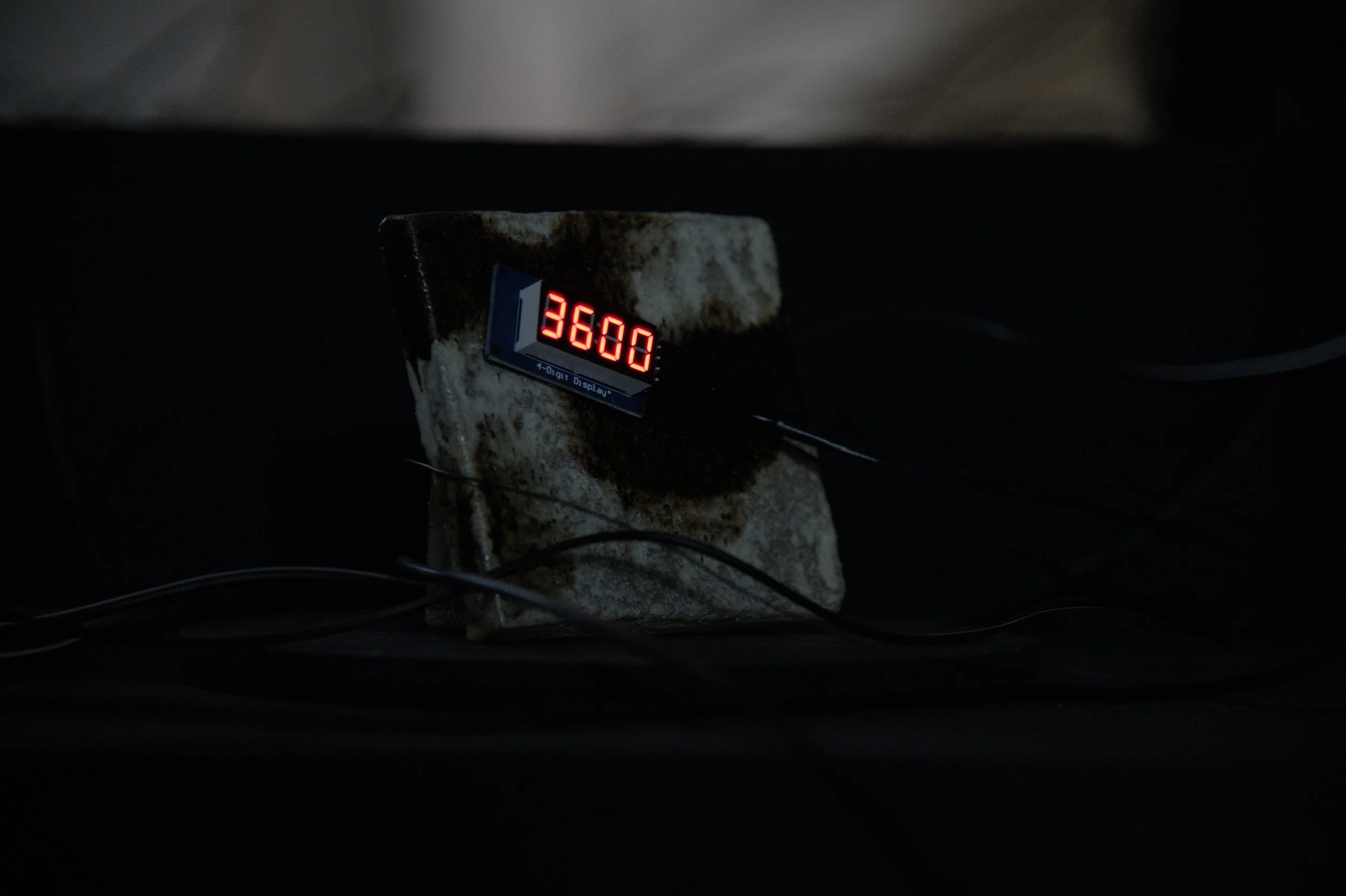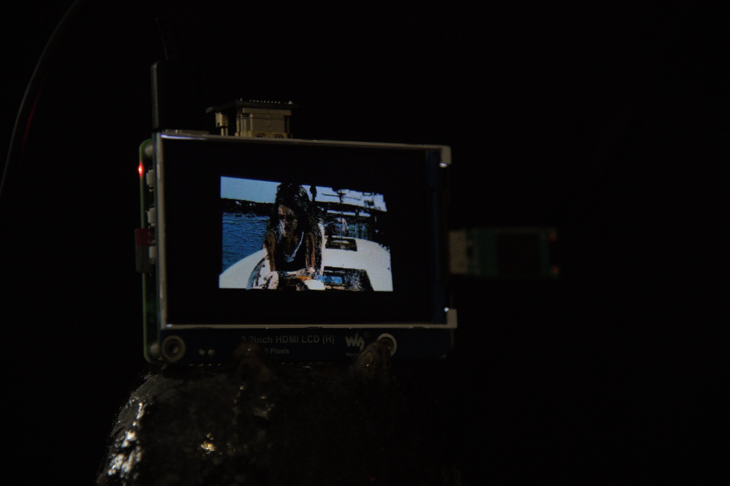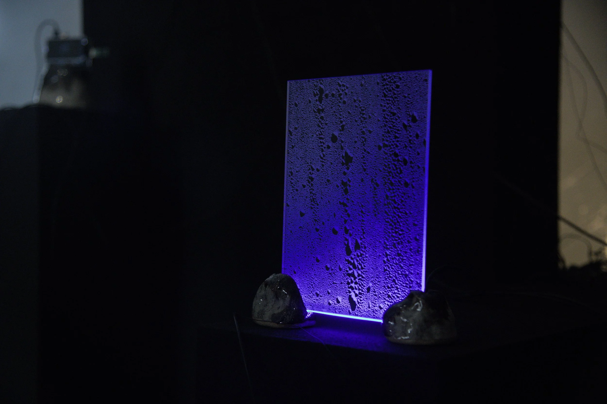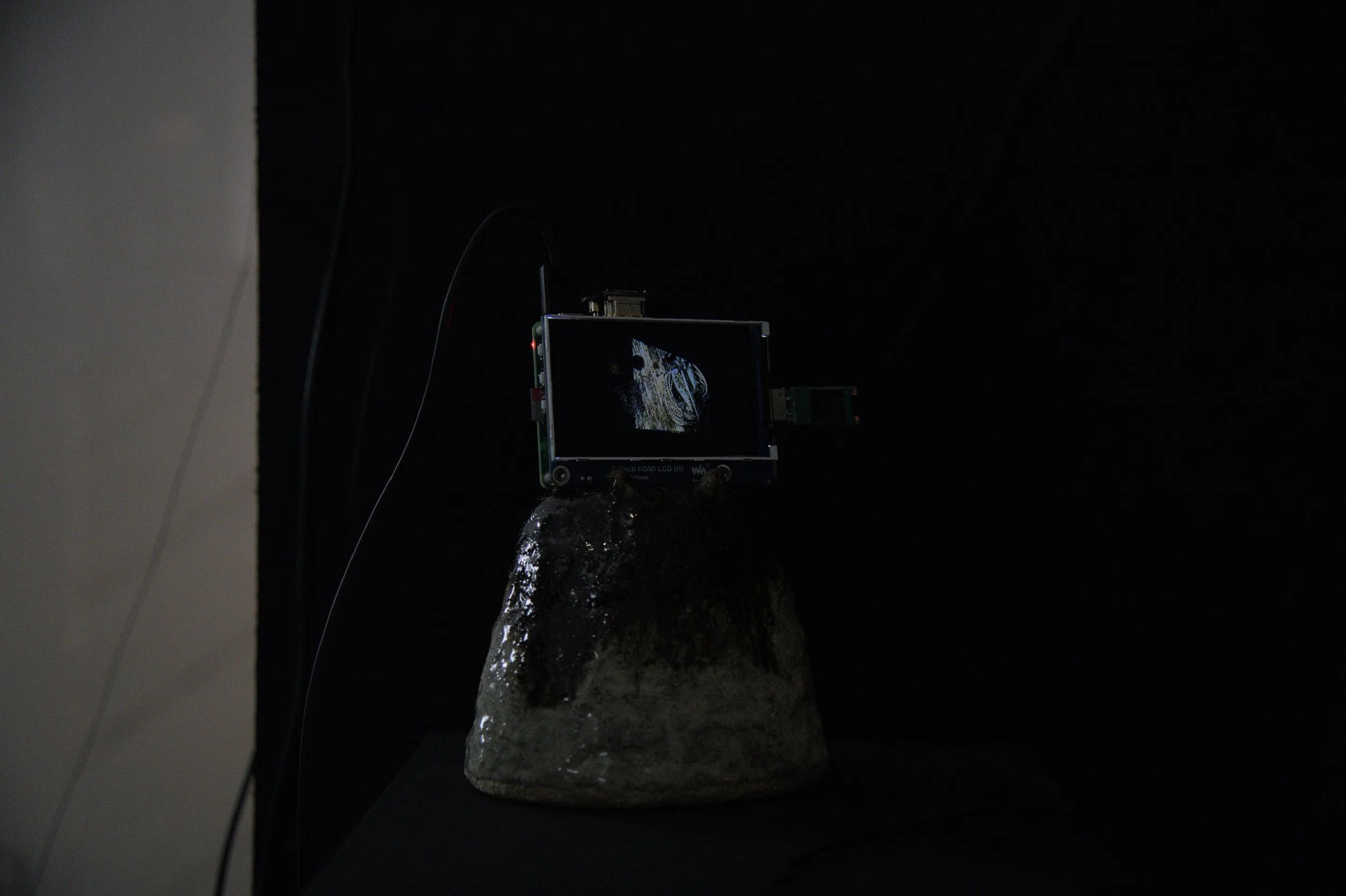 Blending these new technological tools with my ceramic practice, I created a deeply personal installation rooted in my own childhood visit to the Mary Rose. The work began with a letter I wrote to the ship, recalling vivid sensory and contextual memories. These memories were transformed into tactile “memory artefacts” that respond to the viewer’s touch, bridging the gap between my personal past and the audience’s present experience. The installation unfolds as a multi-sensory landscape: a projection of the letter cast onto a rotating, shifting rock; the scent of tar and damp air; the sound of my voice reading the letter aloud; an acrylic sheet etched with condensation droplets glowing softly in blue; a digital display showing the Mary Rose admission price; a pair of works digitally distorting a scene from the film 'According to Greta'; and a ceramic grip inviting viewers to physically activate the piece.